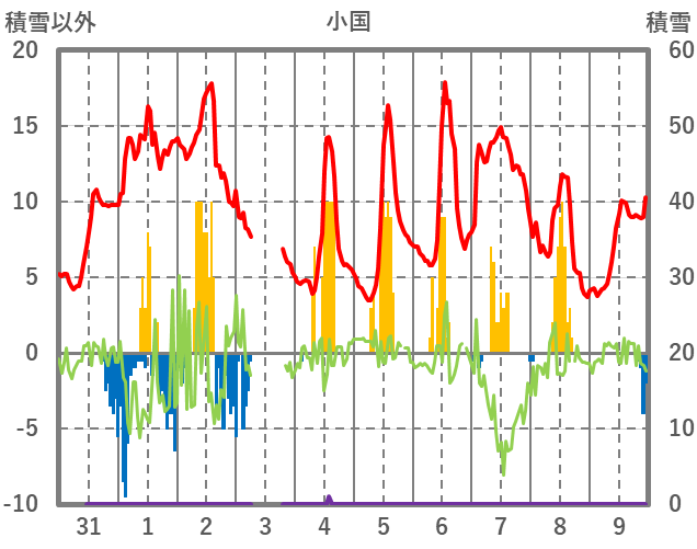 | 日 | 時 | 気温 | 降水 | 風向/風速 | 日照 | 積雪 | 降雪 |