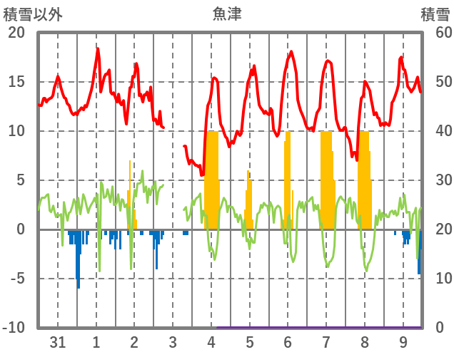 | 日 | 時 | 気温 | 降水 | 風向/風速 | 日照 | 積雪 | 降雪 |
