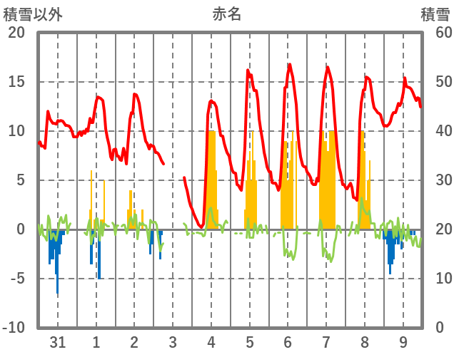 | 日 | 時 | 気温 | 降水 | 風向/風速 | 日照 | 積雪 | 降雪 |