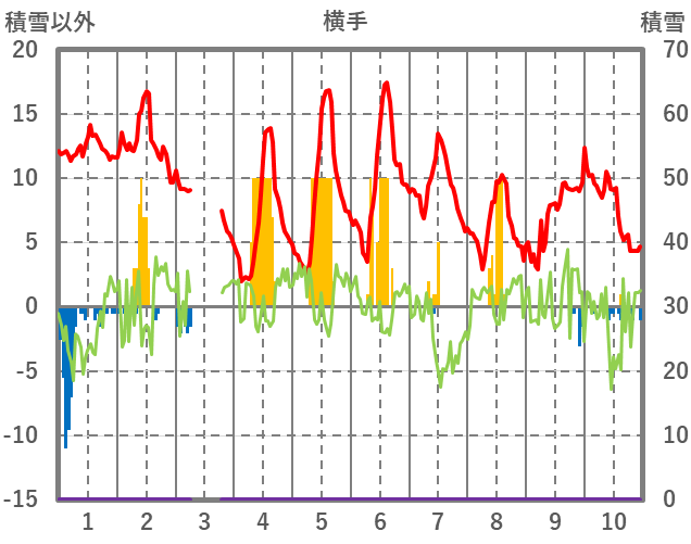 | 日 | 時 | 気温 | 降水 | 風向/風速 | 日照 | 積雪 | 降雪 |