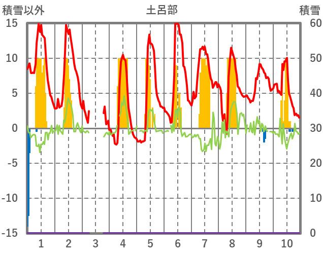| 日 | 時 | 気温 | 降水 | 風向/風速 | 日照 | 積雪 | 降雪 |