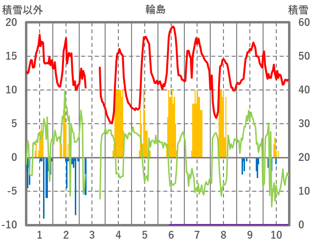 | 日 | 時 | 気温 | 降水 | 風向/風速 | 日照 | 積雪 | 降雪 |