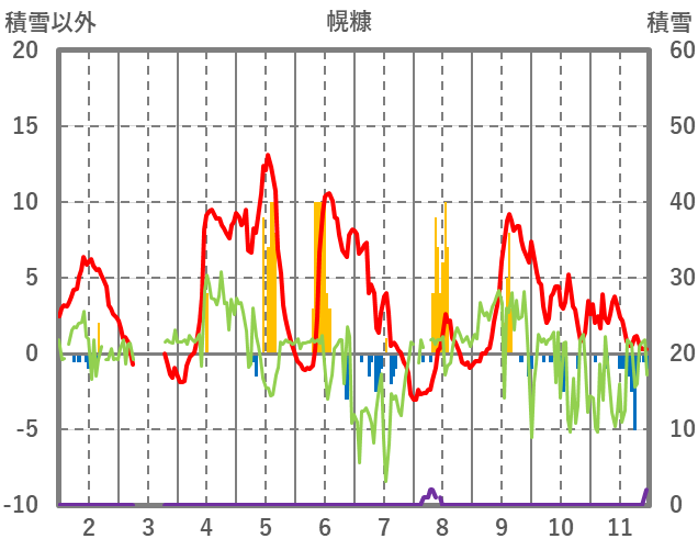 | 日 | 時 | 気温 | 降水 | 風向/風速 | 日照 | 積雪 | 降雪 |