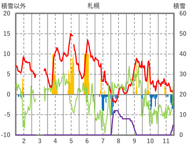 | 日 | 時 | 気温 | 降水 | 風向/風速 | 日照 | 積雪 | 降雪 |