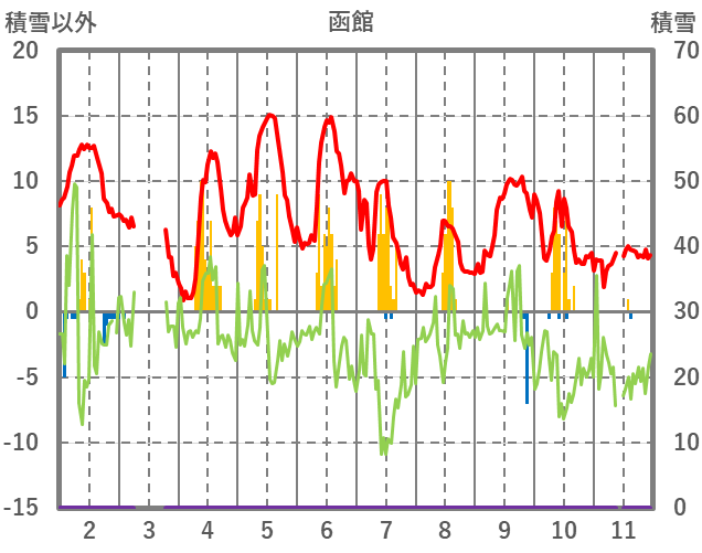 | 日 | 時 | 気温 | 降水 | 風向/風速 | 日照 | 積雪 | 降雪 |
