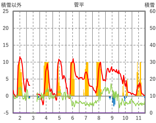 | 日 | 時 | 気温 | 降水 | 風向/風速 | 日照 | 積雪 | 降雪 |