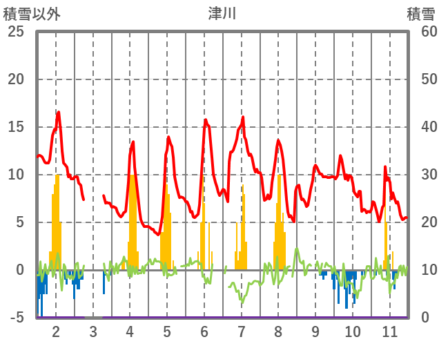 | 日 | 時 | 気温 | 降水 | 風向/風速 | 日照 | 積雪 | 降雪 |