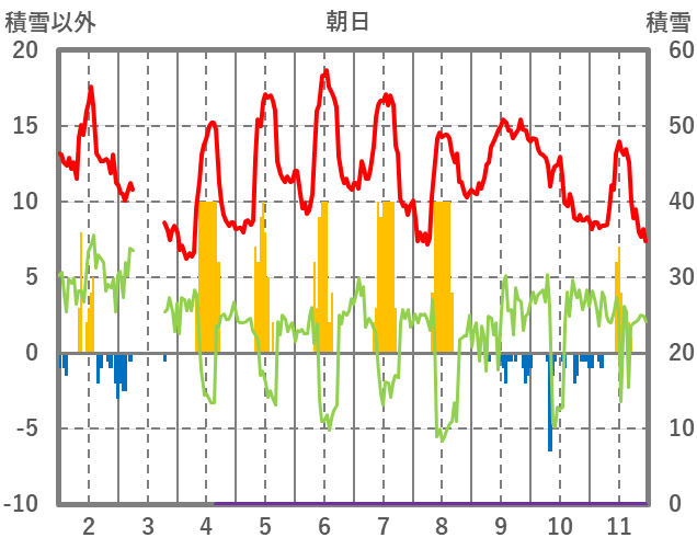 | 日 | 時 | 気温 | 降水 | 風向/風速 | 日照 | 積雪 | 降雪 |