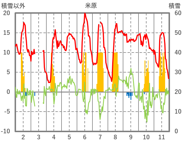 | 日 | 時 | 気温 | 降水 | 風向/風速 | 日照 | 積雪 | 降雪 |