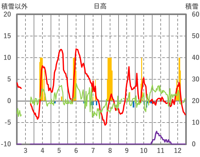 | 日 | 時 | 気温 | 降水 | 風向/風速 | 日照 | 積雪 | 降雪 |