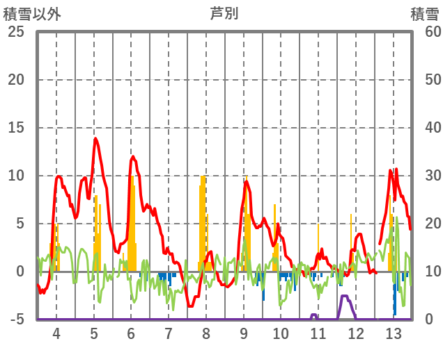 | 日 | 時 | 気温 | 降水 | 風向/風速 | 日照 | 積雪 | 降雪 |
