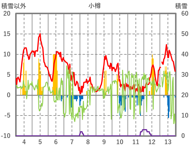 | 日 | 時 | 気温 | 降水 | 風向/風速 | 日照 | 積雪 | 降雪 |