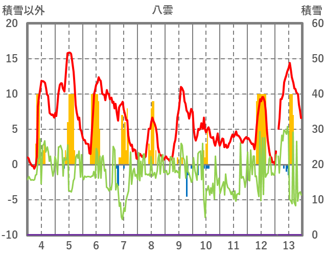 | 日 | 時 | 気温 | 降水 | 風向/風速 | 日照 | 積雪 | 降雪 |