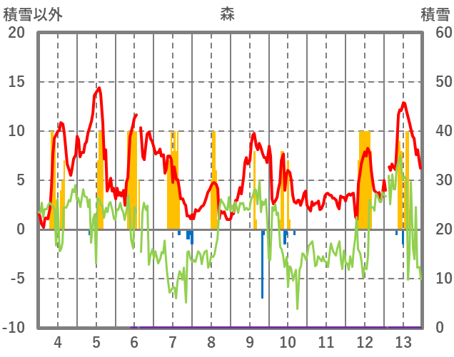 | 日 | 時 | 気温 | 降水 | 風向/風速 | 日照 | 積雪 | 降雪 |