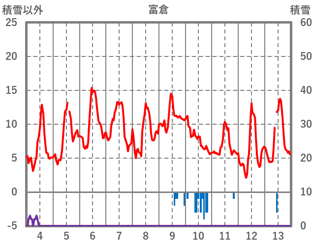 | 日 | 時 | 気温 | 降水 | 風向/風速 | 日照 | 積雪 | 降雪 |