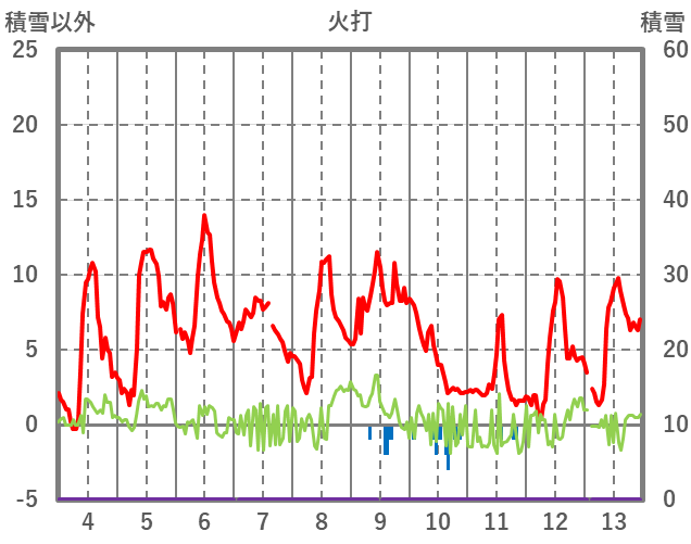 | 日 | 時 | 気温 | 降水 | 風向/風速 | 日照 | 積雪 | 降雪 |