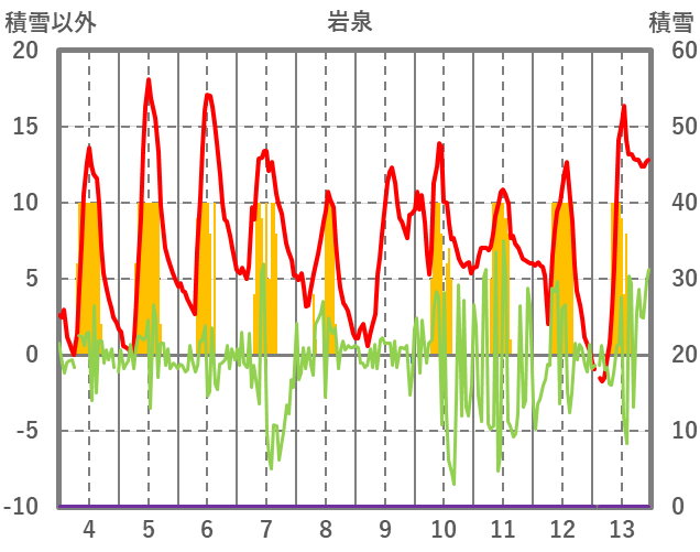| 日 | 時 | 気温 | 降水 | 風向/風速 | 日照 | 積雪 | 降雪 |