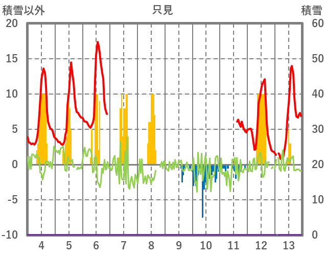 | 日 | 時 | 気温 | 降水 | 風向/風速 | 日照 | 積雪 | 降雪 |