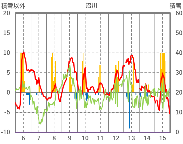 | 日 | 時 | 気温 | 降水 | 風向/風速 | 日照 | 積雪 | 降雪 |