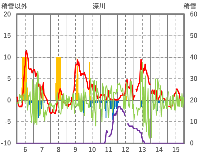 | 日 | 時 | 気温 | 降水 | 風向/風速 | 日照 | 積雪 | 降雪 |