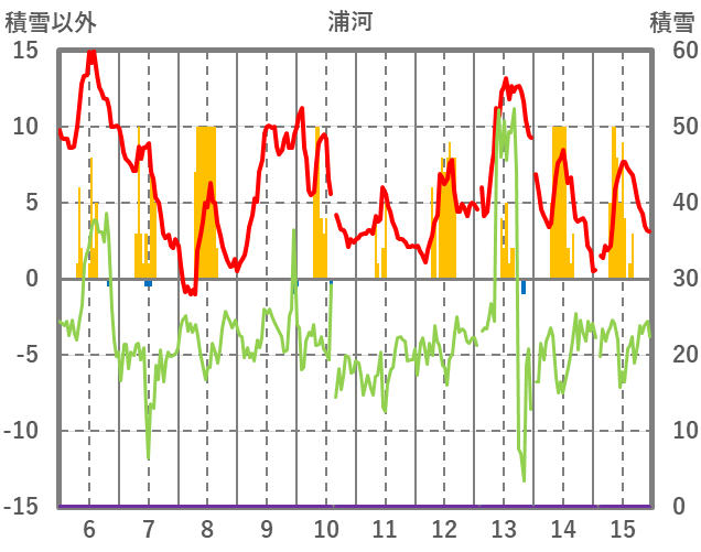 | 日 | 時 | 気温 | 降水 | 風向/風速 | 日照 | 積雪 | 降雪 |