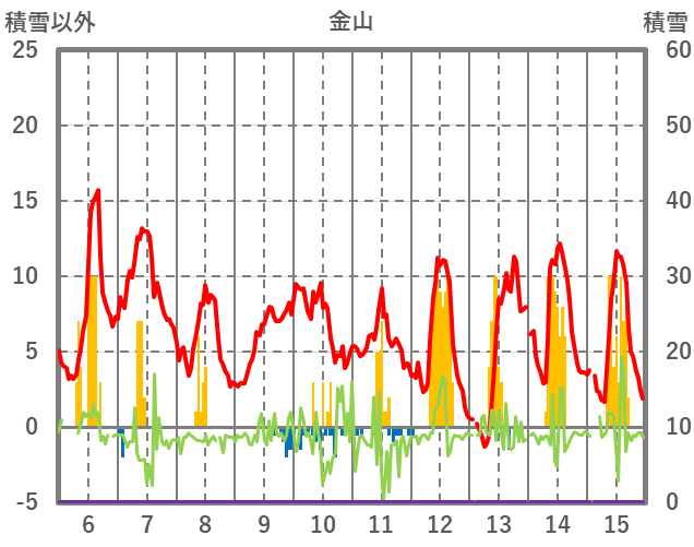 | 日 | 時 | 気温 | 降水 | 風向/風速 | 日照 | 積雪 | 降雪 |