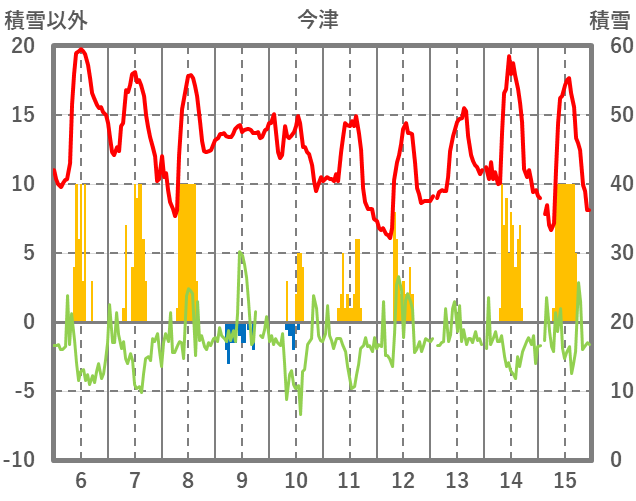 | 日 | 時 | 気温 | 降水 | 風向/風速 | 日照 | 積雪 | 降雪 |