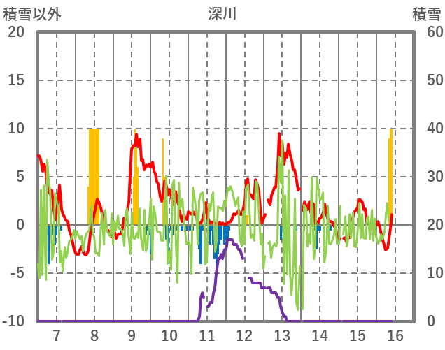 | 日 | 時 | 気温 | 降水 | 風向/風速 | 日照 | 積雪 | 降雪 |