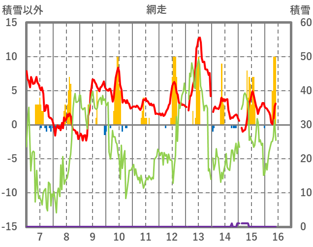 | 日 | 時 | 気温 | 降水 | 風向/風速 | 日照 | 積雪 | 降雪 |
