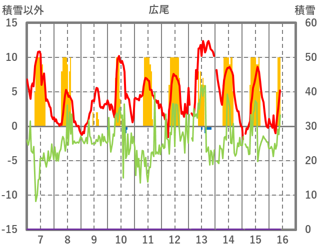 | 日 | 時 | 気温 | 降水 | 風向/風速 | 日照 | 積雪 | 降雪 |
