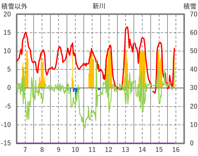 | 日 | 時 | 気温 | 降水 | 風向/風速 | 日照 | 積雪 | 降雪 |