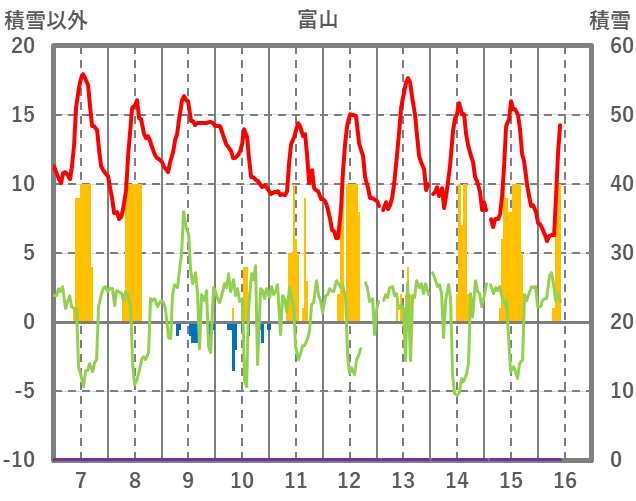 | 日 | 時 | 気温 | 降水 | 風向/風速 | 日照 | 積雪 | 降雪 |