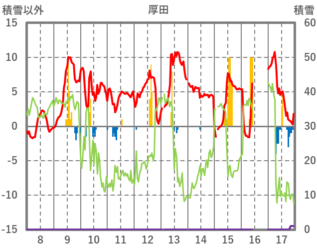 | 日 | 時 | 気温 | 降水 | 風向/風速 | 日照 | 積雪 | 降雪 |