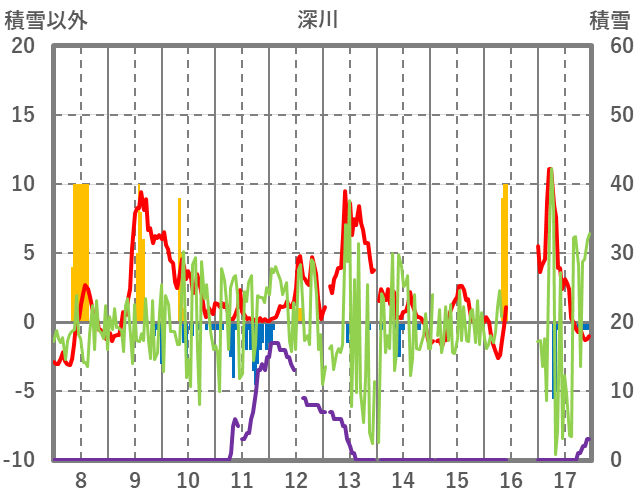| 日 | 時 | 気温 | 降水 | 風向/風速 | 日照 | 積雪 | 降雪 |