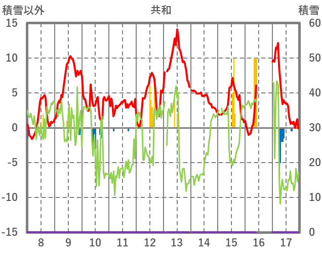 | 日 | 時 | 気温 | 降水 | 風向/風速 | 日照 | 積雪 | 降雪 |