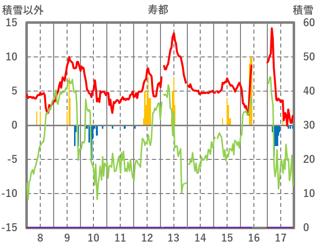 | 日 | 時 | 気温 | 降水 | 風向/風速 | 日照 | 積雪 | 降雪 |