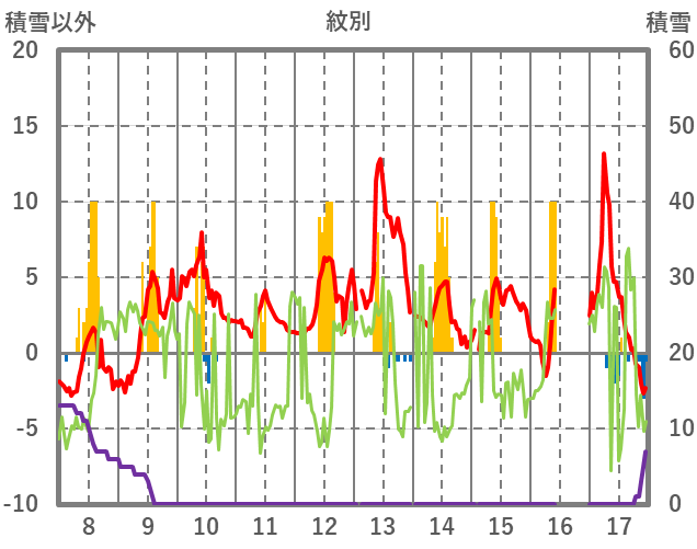 | 日 | 時 | 気温 | 降水 | 風向/風速 | 日照 | 積雪 | 降雪 |