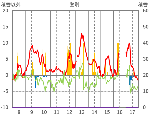 | 日 | 時 | 気温 | 降水 | 風向/風速 | 日照 | 積雪 | 降雪 |