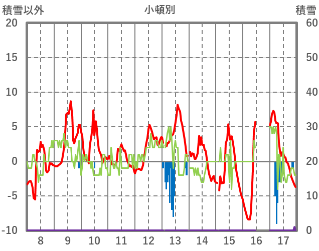 | 日 | 時 | 気温 | 降水 | 風向/風速 | 日照 | 積雪 | 降雪 |