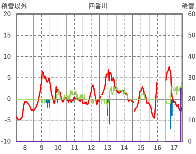 | 日 | 時 | 気温 | 降水 | 風向/風速 | 日照 | 積雪 | 降雪 |
