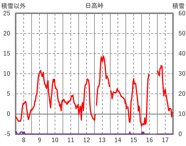 | 日 | 時 | 気温 | 降水 | 風向/風速 | 日照 | 積雪 | 降雪 |