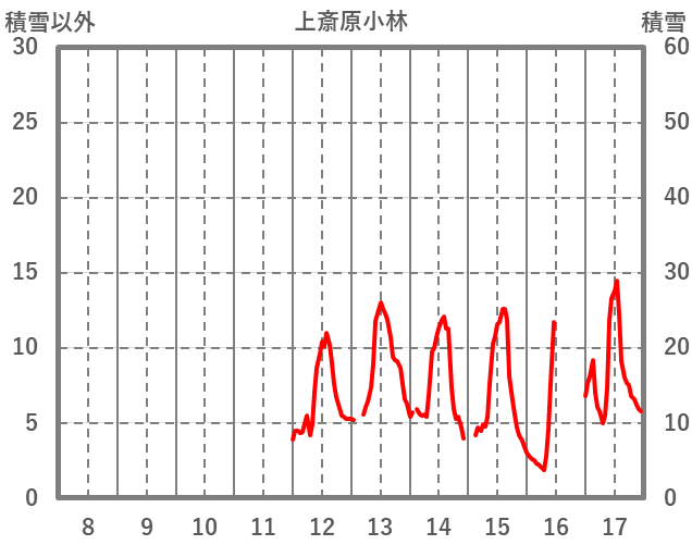 | 日 | 時 | 気温 | 降水 | 風向/風速 | 日照 | 積雪 | 降雪 |