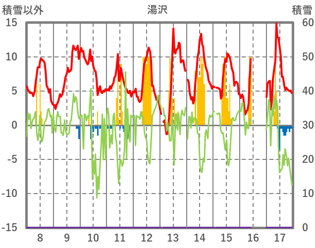 | 日 | 時 | 気温 | 降水 | 風向/風速 | 日照 | 積雪 | 降雪 |