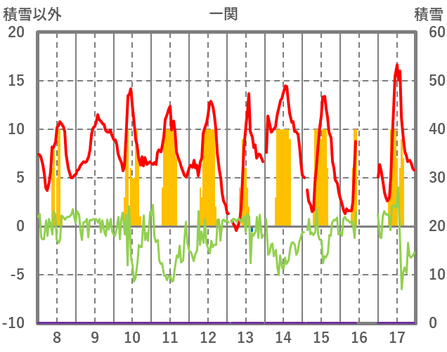 | 日 | 時 | 気温 | 降水 | 風向/風速 | 日照 | 積雪 | 降雪 |