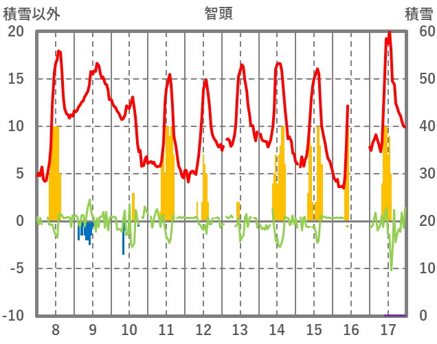 | 日 | 時 | 気温 | 降水 | 風向/風速 | 日照 | 積雪 | 降雪 |