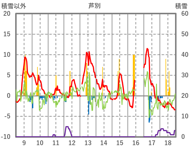 | 日 | 時 | 気温 | 降水 | 風向/風速 | 日照 | 積雪 | 降雪 |