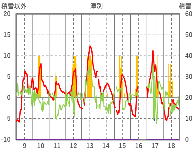 | 日 | 時 | 気温 | 降水 | 風向/風速 | 日照 | 積雪 | 降雪 |