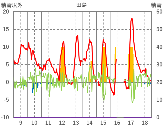| 日 | 時 | 気温 | 降水 | 風向/風速 | 日照 | 積雪 | 降雪 |