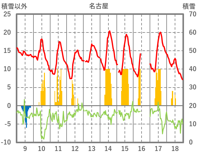 | 日 | 時 | 気温 | 降水 | 風向/風速 | 日照 | 積雪 | 降雪 |