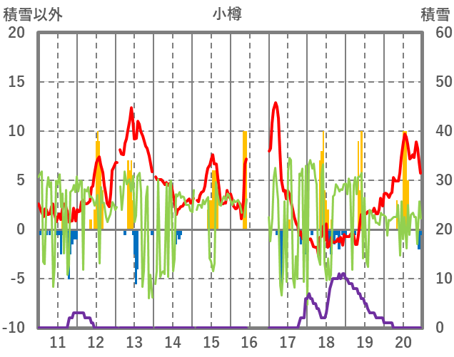 | 日 | 時 | 気温 | 降水 | 風向/風速 | 日照 | 積雪 | 降雪 |